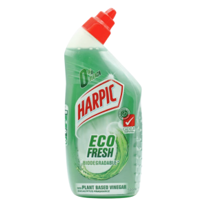 Harpic Eco Fresh is a bleach-free toilet cleaner made with plant-based vinegar, offering a biodegradable, eco-friendly clean with a fresh euclyptus scent.