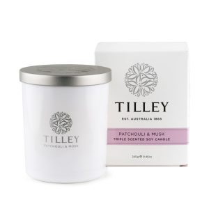 Earthy patchouli and musk scent, burns up to 45 hours. Made from premium soy wax, triple scented.