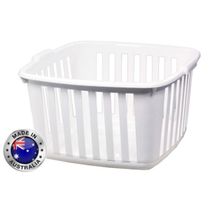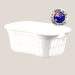 Plastic white laundry basket hugs around the hip, making it easier to carry, thanks to the ergonomic design & built in handles. Made in Australia, 60x39x24cm.