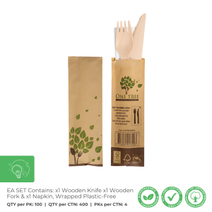 Wrapped Plastic Free Cutlery set containing a wooden knife, fork & napkin. The One Tree Wooden Cutlery Range is the ideal solution for your business' transition away from plastic cutlery.