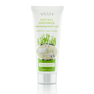Tilley Natural Goat's Milk Hand Cream, enriched with organic Shea Butter, Macadamia Oil, and Coco Butter, deeply nourishes dry skin and cuticles for a soft, glowing finish.