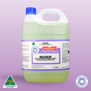 MILECHLOR is a heavy-duty liquid chlorinated foaming cleaner/sanitiser formulated to remove fat, blood, greases, oils, and carbonised soils from most washable surfaces.