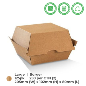 Suitable for both hot and cold foods, this Burger Box is made from natural corrugated, 100% recyclable cardboard. Versatile, ideal for burgers, snacks, chips. Home & Industrial Compostable.