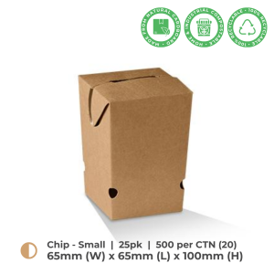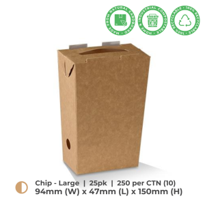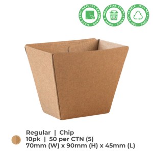 Suitable for both hot and cold foods, this Chip Carton is made from natural corrugated, 100% recyclable cardboard. Versatile, ideal for snacks, chips & fried finger food. Home & Industrial Compostable.