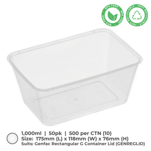 Rectangular G Containers (1000ml) are ideal for food storage and a various other purposes. These microwave-save containers, made from recyclable, BPA-free, polypropylene plastic, are available in cartons of 500.
