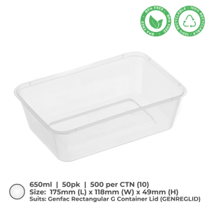Rectangular G Containers (650ml) are ideal for food storage and a various other purposes. These microwave-save containers, made from recyclable, BPA-free, polypropylene plastic, are available in cartons of 500.