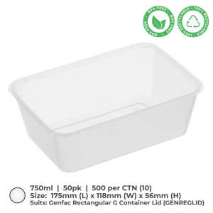 Rectangular G Containers (750ml) are ideal for food storage and a various other purposes. These microwave-save containers, made from recyclable, BPA-free, polypropylene plastic, are available in cartons of 500.