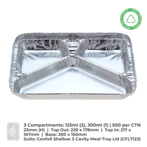 Made from quality foil, Confil wrinklewall trays are 100% recyclable and endlessly renewable. Versatile, 3 cavity tray, suits CFL7123 lid.