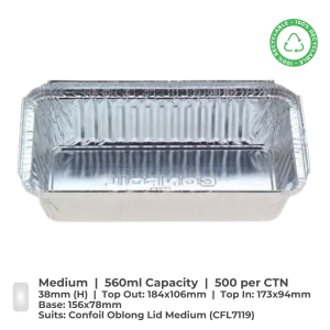 Made from quality foil, Confil wrinklewall trays are 100% recyclable and endlessly renewable. Versatile, 560ml capacity, suits CFL7119 lid.