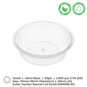 Small Round Container (40ml) are ideal for storing sauce and condiments. Made from recyclable, BPA-free, clear polypropylene plastic, these microwave-safe containers come in cartons of 1,000.