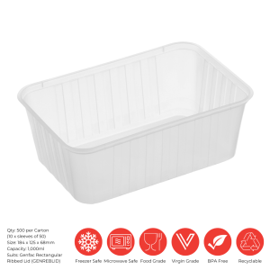 Ribbed Rectangular Containers (1000ml) are ideal for food storage and a various other purposes. These freezer grade, microwave-save containers, made from recyclable, BPA-free, polypropylene plastic, are available in cartons of 500.