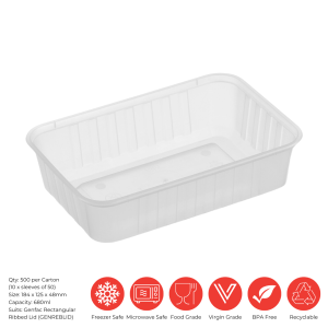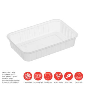 Ribbed Rectangular Containers (500ml) are ideal for food storage and a various other purposes. These freezer grade, microwave-save containers, made from recyclable, BPA-free, polypropylene plastic, are available in cartons of 500.