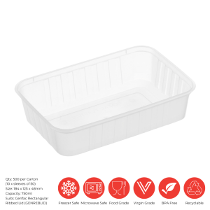 Ribbed Rectangular Containers (750ml) are ideal for food storage and a various other purposes. These freezer grade, microwave-save containers, made from recyclable, BPA-free, polypropylene plastic, are available in cartons of 500.