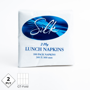 These white 2 Ply Lunch Napkins GT-Fold measure 30cm x 30cm with a durable 32gsm weight and packed 100 per packet, ideal for cost-effective and convenient food service use.