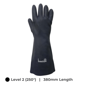 Neoprene gloves with excellent chemical and heat resistance, seamless cotton liner, 380mm length for arm protection, textured grip, reusable, latex-free, packed in pairs. Meets EN407:2004 heat resistant level 2 (250°).