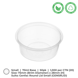 Small Round Container (100ml) are ideal for storing sauce and condiments. Made from recyclable, BPA-free, clear polypropylene plastic, these microwave-safe containers come in cartons of 1,000.
